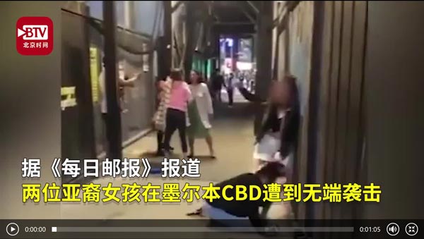 据《每日邮报》报道 ,当地时间4月16日,两名亚裔女孩在墨尔本CBD遭到无端袭击。旁观者称:两个白人女孩跟着这两个亚裔女孩,不停地辱骂,并在遭到反驳后,动手打了她们。当地媒体称一名围观男子还趁乱偷走了被打女生的AirPods。警方称,两名女孩均是中国留学生。墨尔本市长也发推特谴责袭击者,称她们不能反映当地人的价值观。