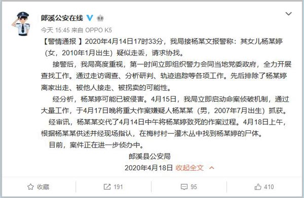 据安徽省宣城市郎溪县公安局官方微博(@郎溪公安在线)4月18日通报,4月14日17时33分,我局接杨某文报警称:其女儿杨某婷(女,2010年1月出生)疑似走丢,请求协找。
