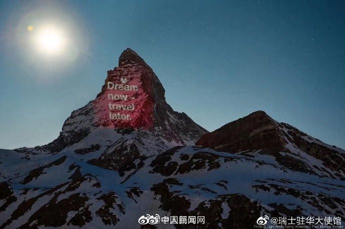 【 瑞士阿尔卑斯名峰投影五星红旗】 #关注新冠肺炎#据 @瑞士驻华大使馆 ,北京时间4月19日上午8点至10点,一面五星红旗被投影在瑞士著名的马特宏峰上。采尔马特谨以此行动祝福远方朋友,特别是姊妹城市丽江,盼望与大家早日重逢。瑞士阿尔卑斯名峰将和中国人民团结一心,借此方式传递希望和勇气,共克时艰!