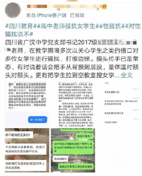 4月19日,新浪微博一自称为四川省广汉中学应届高三学生的网友发帖,举报该校高三教师陈某对多位学生性骚扰,“打擦边球、拉手已是常态”。