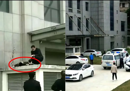 视频显示,一名身着黑衣男子躺倒在大楼下的通风井上部,多名身着黑色制服人员在一旁看护,附近停着一辆救护车,有医护人员正在下车前往现场查看伤情。