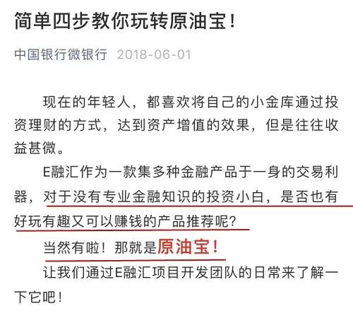 25日上午一位不愿具名的法律人士提出,原油宝产品的设计存在明显漏洞,该产品与国际原油期货价格挂钩,表现出了期货交易的高风险属性;然而在推销时,原油宝却又是以低风险银行理财产品的形象示人,声称“投资小白”也可参与。