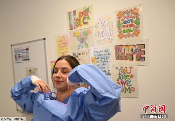 图为英国剑桥皇家帕普沃斯医院内,医护人员员穿戴防护设备。