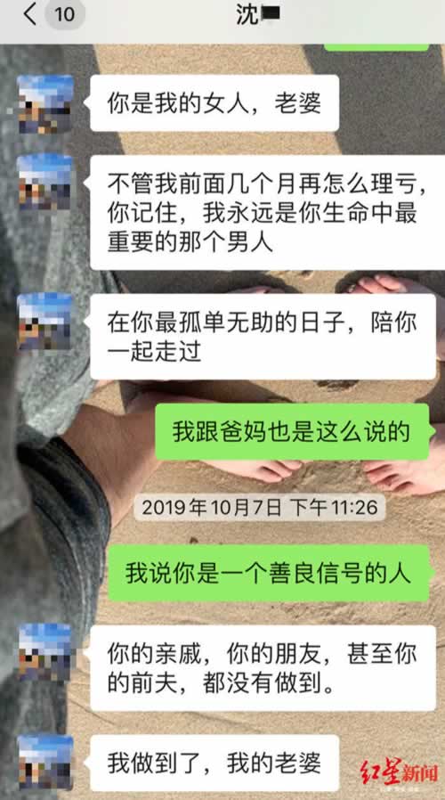 而在2019年5月期间,沈某又不断向她说出“我是爱你的” “你是我的女人”“ 我离不开你”“ 我愿意照顾你和孩子”等承诺,让她迷失在这段感情中;