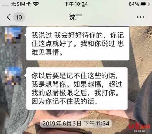 但在5月过后,两人事情在前妻张某面前“曝光”后,沈某的态度开始变得反复,上一秒说爱你、抱你,下一秒却能骂你、打你,就像打一棒子再给一个甜枣。这一系列的“洗脑”后,陈优丽已经深陷其中。
