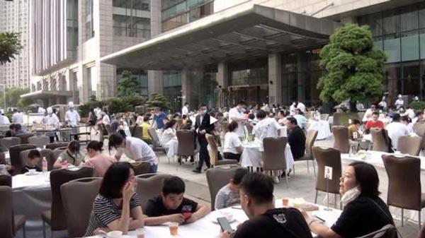 湖北武汉,酒店行业因疫情受到不小的冲击,武汉市一家知名五星级酒店在大门外的广场,摆满餐桌开起大排档,现场露天烧烤,吸引了不少市民前来消费。顾客说,菜品质量和价格都挺好,武汉人要一起努力。