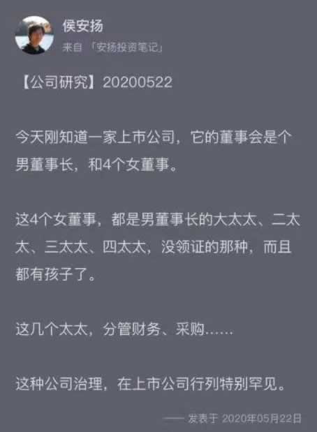 5月22日,侯安扬在一个投资社群发布了一篇关于公司研究的文章,没想到在最近股市行情平淡如水的情况下,竟然成为今天投资圈讨论最火的事情。