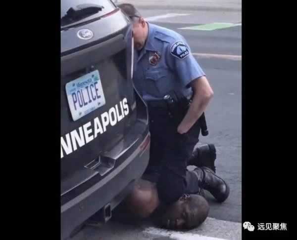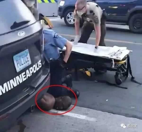 第二,下面这张广为流传的图片和短视频,配上“我不能呼吸”的微弱呼救,加深了善良民众对美国警方暴力执法的无比愤怒,连特朗普一开始也被忽悠,站出来严厉谴责,并呼吁依法追究几名警察的法律责任——注意,美国总统没有司法权,不得干预司法个案,他只能呼吁,无权指令或指导如何办案。