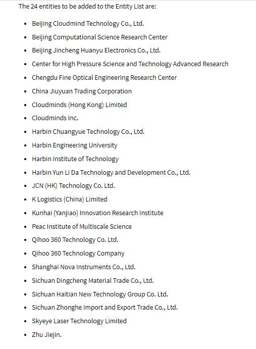 被列入清单的中国科技企业包括: