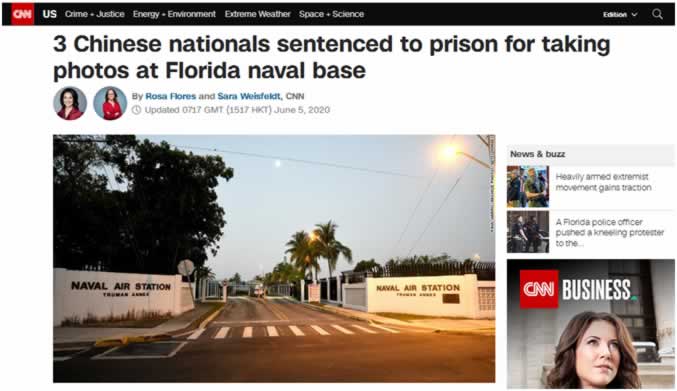 【环球网报道】美国有线电视新闻网(CNN)5日报道称,当地时间4日,3名中国公民因进入美国佛罗里达州基韦斯特的海军航空基地禁区拍照被判入狱。