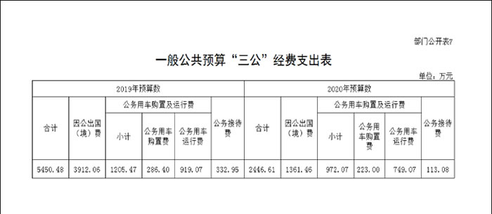 财政部网站6月11日发布《财政部2020年度部门预算》,财政部2020年“三公”经费预算数为2446.61万元,其中:因公出国(境)费1361.46万元,公务用车购置及运行费972.07万元,公务接待费113.08万元。2020年“三公”经费预算比2019年减少3003.87万元,压缩55.11%,主要原因:按照党中央、国务院关于过紧日子的有关要求,厉行节约办一切事业,大力压减因公出国(境)任务、公务用车费用和公务接待费支出。