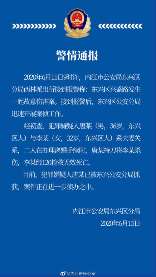 (原标题:四川内江一男子办理离婚手续时杀害妻子 已被警方抓获)