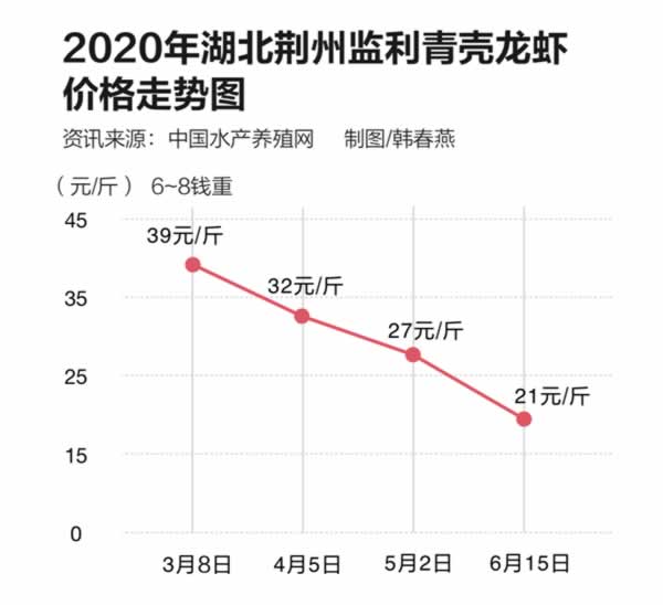今年全国范围内小龙虾价格普遍回落。中国水产养殖网监测数据显示,5月以来,全国小龙虾市价均出现不同程度下滑,在湖北、江苏、上海、成都、长沙等地水产市场,2~4钱重量的小龙虾价格一度跌至6~7元每斤,相比去年同期15~18元每斤的行情,市价已腰斩。
