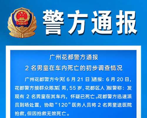 广州花都警方今天(6月21日通报;6月20日,花都警方接群众陈某(男,55岁,花都区人服警称:发现有2名男童在其车内,怀疑已死亡。花都警方迅速派员到场处置,协助“120”医务人员将2名男童送医院抢教,但因抢救无效死亡。