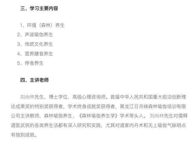 澎湃新闻在日月峡大森林旅游集团有限公司官网查询发现,一则《2020年春节、元宵森林瑜伽养生补习班通知》显示,主讲老师刘尚林先生系博士学位,高级心理咨询师,首届中华人民共和国重大前沿创新理论成果奖的特别奖获得者,学术终身成就奖获得者,黑龙江日月峡森林瑜伽培训有限公司主讲教师,森林瑜伽养生、《森林瑜伽养生学》学术带头人。