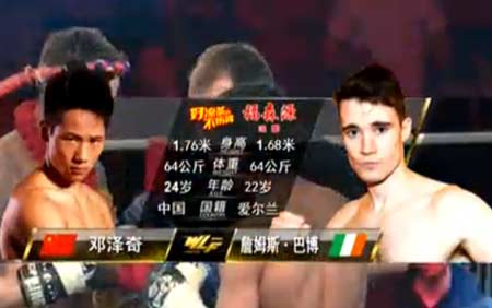武林风20150509期比赛视频:武林风20150509期64公斤级比赛中中,“泰拳小侯爷”邓泽奇对阵新西兰选手詹姆斯·巴博,最终号称中国勇士的邓泽奇一回合KO爱尔兰选手詹姆斯·巴博,一起来欣赏精彩视频!