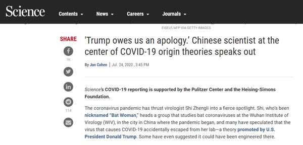 原标题:石正丽接受《科学》杂志专访:“特朗普欠我们一个道歉”)