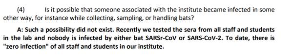 石正丽还表示,已对其实验室的所有员工和学生进行了血清检测,没有人感染蝙蝠SARSr-CoV 或新冠病毒,并称迄今为止武汉病毒所的所有员工和学生都是“零感染”。↓