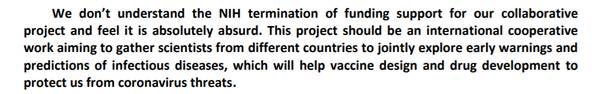 今年4月24日,美国国立卫生研究院(NIH)在白宫的授意下决定取消对位于纽约市的生态健康联盟的拨款,其中包括武汉病毒研究所的蝙蝠病毒研究。《科学》杂志称,石正丽在采访中对此表示尤为失望。她说:“我们不理解美国 NIH(为什么)终止了我们合作项目的资金支持,我们认为这绝对是荒谬的。”↓