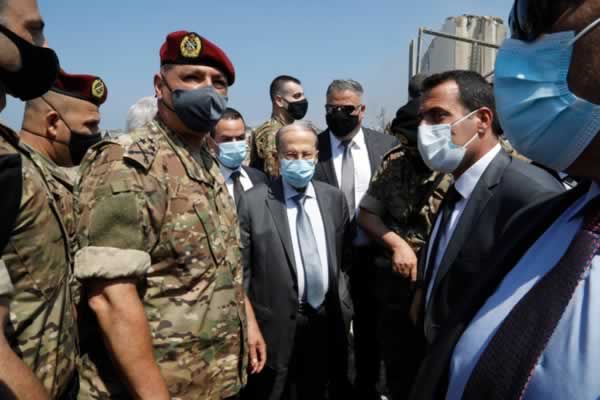 △黎巴嫩总统与军方领导人来到爆炸地点