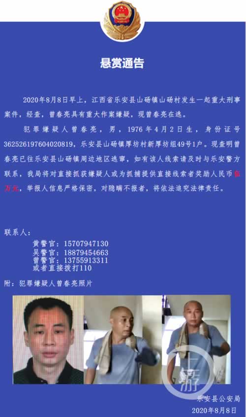 8月8日晚,江西省抚州市乐安县“乐安公安”发布悬赏通告,8月8日早上,乐安县山砀镇山砀村发生一起重大刑事案件,经查,曾春亮具有重大作案嫌疑,现曾春亮在逃。