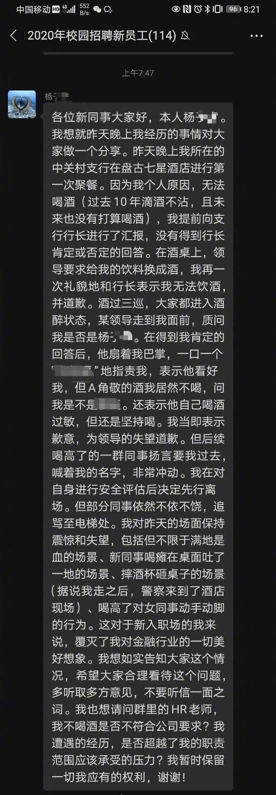 此事刚在网络传播的时候,很多人甚至怀疑信息的真实性。要说十几二十年前,有些行业喝酒风气泛滥,“酒文化”恶俗不堪,还不太出乎大家意料。可如今的银行从业者需要像网帖中那样疯狂喝酒,并对不喝酒的同事扇耳光、辱骂吗?有些金融行业的网友就表态,他们真没见过这样的。