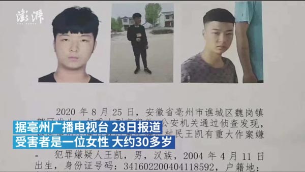 8月27日,安徽亳州公安发悬赏通报,25日谯城区魏岗镇辖区发生重大刑事案件,村民王凯(2004年出生)有重大作案嫌疑,警方悬赏10万。一名警官表示案件在侦办。据亳州广电28日报道:受害人系其婶婶,村民对其印象不错,王凯早已不上学。