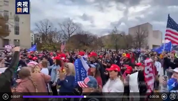 据美国媒体当地时间11月16日报道,在周六(14日)华盛顿举行的“百万人大游行”示威活动结束以后,大批特朗普支持者于周日(15日)再次聚集在华盛顿附近,对此次选举的结果表示抗议。这些抗议者头戴印有“让美国再次伟大”的帽子和手举抗议横幅,呼喊停止窃取选票的口号。