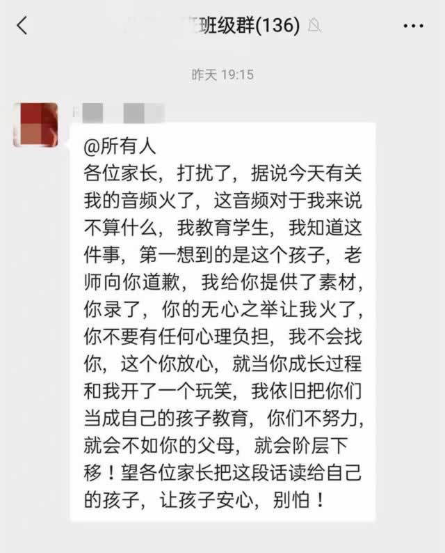 她说,“就当你成长过程和我开了个玩笑,我依旧把你们当成自己的孩子教育,你们不努力,就会不如你的父母,就会阶层下移!望各位家长把这段话读给自己的孩子,让孩子安心,别怕!”