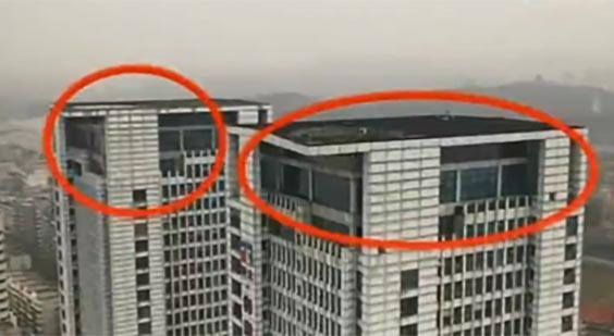 航拍画面显示,这两栋楼的楼顶部分,分别都有两层玻璃外墙房屋,王先生家所在A栋楼顶的两层玻璃建筑之上,甚至建设有小花园。