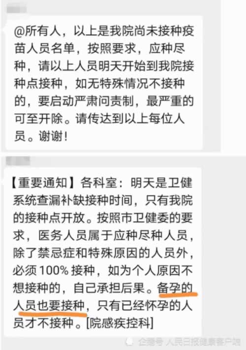 健康时报记者在医生提供的医院工作群截图看到,医院院感疾控科在微信群中发布通知称,“各科室:明天是卫健系统查漏补缺接种时间,只有我院的接种点开放。按照市卫健委的要求,医务人员属于应种尽种人员除了禁忌症和特殊原因的人员外,必须100%接种,如为个人原因不想接种的,自己承担后果。备孕的人员也要接种,只有已经怀孕的人员才不接种。”