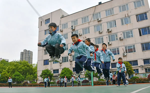 2021年4月8日,在浙江省台州市仙居县第一小学操场,学生们正在玩跳绳游戏。图|视觉中国