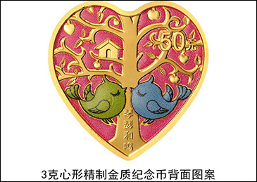 3克心形金质“琴瑟和鸣”纪念币(5月20日发行)背面图案为两只小鸟、树、果实等组合图案,并刊“琴瑟和鸣”字样及面额。