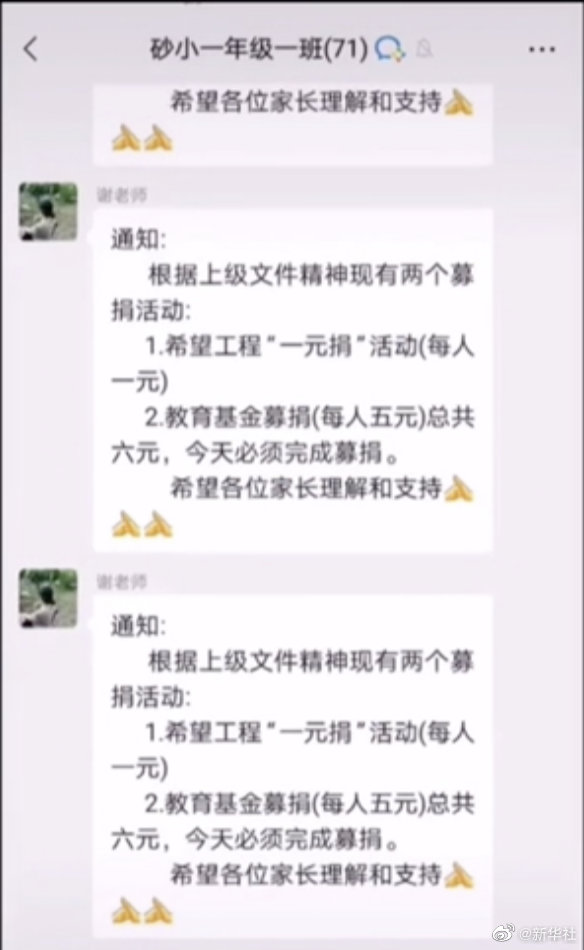 @新华社 5月20日消息,近日,湖南省湘西土家族苗族自治州永顺县一名教师让未参加捐款的学生排队录像,并将视频发至家长群中,动员学生家长募捐。永顺县教育和体育局回应,经查,本次募捐是由永顺县教育基金会发起,募集款项将全部用于奖励优秀师生和教育工作者、救助有特殊困难的师生以及开展“园丁之家”等公益慈善活动。