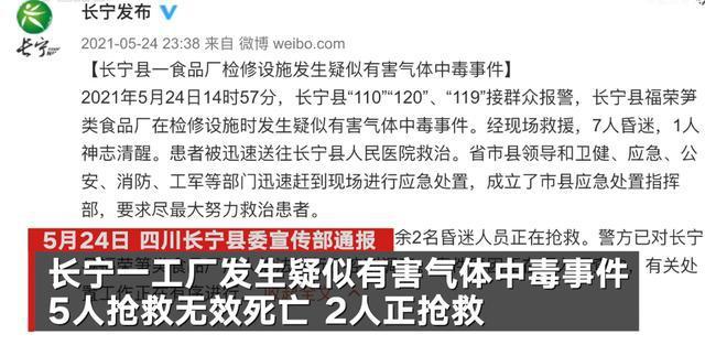 原标题;四川长宁一食品厂检修设施发生疑似有害气体中毒事件,已致5人死亡