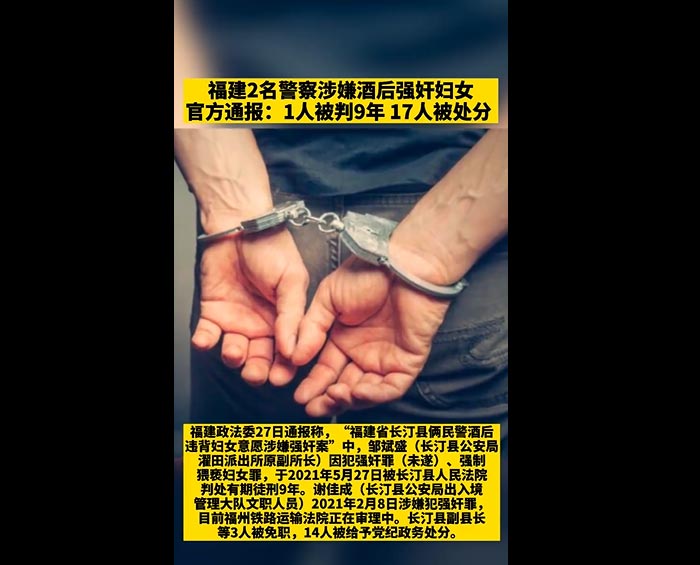 原标题:福建2名警察涉嫌酒后强奸妇女,官方通报:1人被判9年 17人被处分