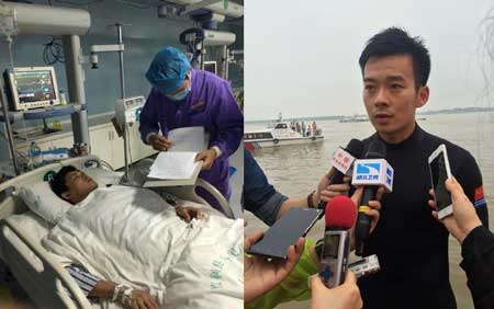 6月2日3时许,24岁小伙子官东潜入水中搜救,将自己的救生设备,交给沉船发现的21岁重庆籍船员陈书涵使用,成功将其救出。官东上岸时,耳朵、鼻孔全是机油,眼睛充血。图为在医院接受救治的陈书涵(左)与在救援现场接受采访的英雄官东(右)。