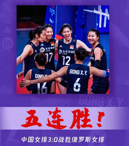 6月18日晚,2021世界排球联赛中,中国女排3:0战胜俄罗斯女排,取得5连胜!祝贺!按照赛程,中国女排将于北京时间6月19日22:00迎战波兰女排,一起关注,为中国女排加油!