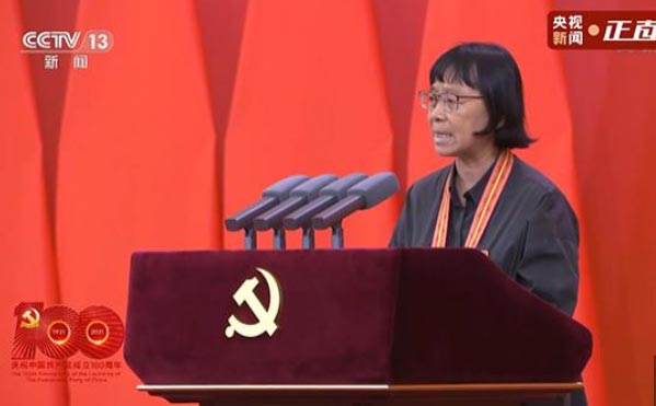 6月29日,在七一勋章颁授仪式上,张桂梅代表“七一勋章”获得者发言。她说:“只要还有一口气,我就要站在讲台上,倾尽全力、奉献所有,九死亦无悔!”