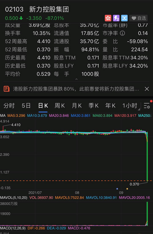 今天,新力控股集团下跌了逾87%,跌幅一度超过90%,市值蒸发约120亿港元。目前,该股票已在香港暂停交易。