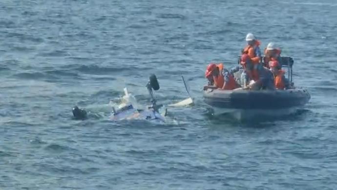 9月30日,江苏连云港。一直升机坠海,经紧急救助,4人被救起,其中,1人经抢救无效死亡。现场近距离救援画面曝光,画面显示,直升机机身倒扣在海面上,仅轮子露出。