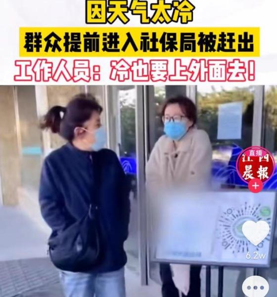 据江西晨报视频报道,10月16日,在沈阳市,因为天气寒冷,群众提前进入社保局被赶出,工作人员称:冷也要到外面去!