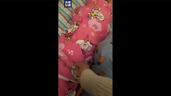 另一段视频也佐证了家长的说法。视频显示,孩子被红色的被子紧紧包裹,被面上还缠着几圈胶带。