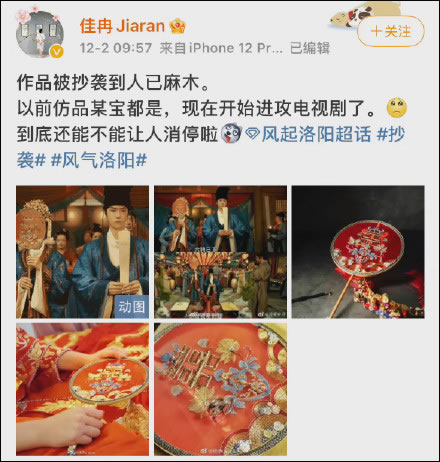 昨天(2日)上午,中国刺绣艺术家@佳冉Jiaran 发帖控诉,《风起洛阳》中的道具团扇抄袭其作品,“作品被抄袭到人已麻木,到底还能不能让人消停啦”。