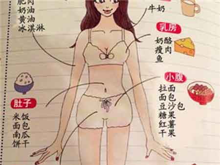 据图片所述,臀部发胖是因吃多了甜圈圈;小腿发胖是因吃多了盐和肉类;吃多了面食、米、豆类、南瓜等小腹会发胖;大腿粗的人爱吃蛋糕、红烧肉和涮肉;吃多了冰激凌,脚踝会发胖等。其中一条让很多人“喜大普奔”:吃多了奶酪、瘦肉和鱼会丰胸。