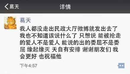 葛天在朋友圈中写到,“我人没走出民政大厅微博就发出去了,我也不知道该说什么了,只想说,能被抢走的爱人不是爱人,能说出的委屈不是委屈。缘起缘灭,天自有安排,谢谢朋友们,我会更好,也祝福他。”