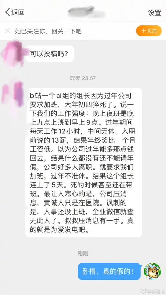 (观察者网讯) 2月7日,微博职场博主“王落北”发消息称,“据多名网友爆料,b站武汉ai审核组组长,因过年期间被要求加班,在晚上9点到早上9点的工作强度下,初五凌晨脑出血猝死。”