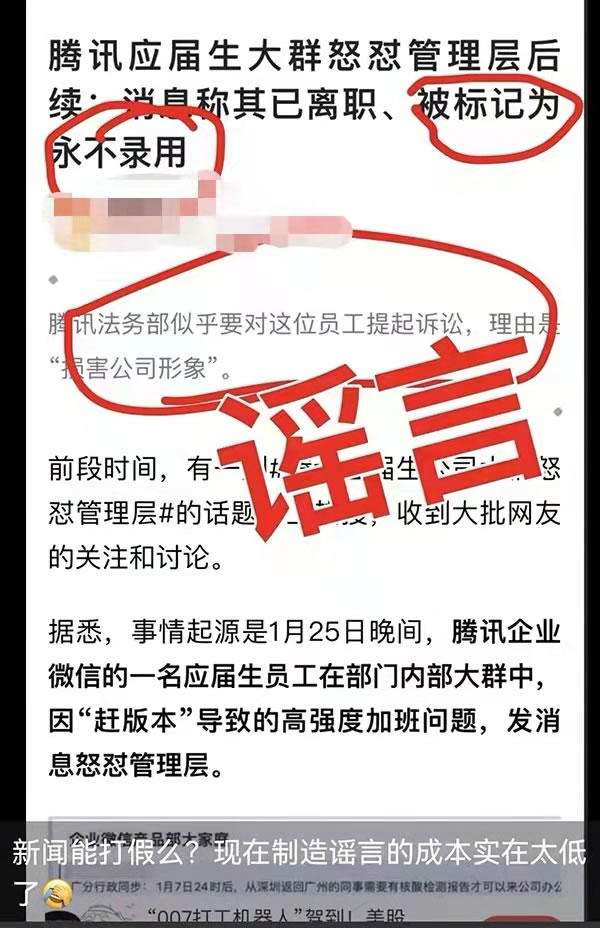 腾讯公关总监张军在朋友圈也否认了前述有关“永不录用”以及“法务部诉讼”的消息:“新闻能打假吗?现在制造谣言的成本实在是太低了。”同时,据腾讯内部人士告诉澎湃新闻记者,在该员工离职前,腾讯曾对其进行挽留。1月25日,在腾讯的部门大群内,该应届生员工公开质疑公司高管只为赶项目进度,忽视员工健康进行不合理的高强度加班。