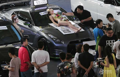 2015年6月27日,2015第十四届中国沈阳国际车展在沈阳国际会展中心举行,一参展汽车商为了促销,在汽车上举办人体盛引爆车展,吸引众多参观者追逐拍摄,互动的参观者可以现场品尝人体盛寿司宴。图为大批媒体记者竞相拍照。