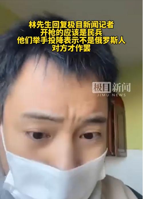 北京时间26日晚上8时许,林先生在微博中称,他们住在基辅西北部,刚才不得已去超市采购,遇到了枪击。两个持突击步枪的乌克兰人在后面边开枪边追他们。他们举手投降并表明他们不是俄罗斯人,对方才作罢。同行的一个中国人和他们路上失散了,几个同行女孩吓哭了。
